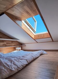 • First loft: cozy sleeping space with shelves, tilting window, LED lighting, decorative wood slats